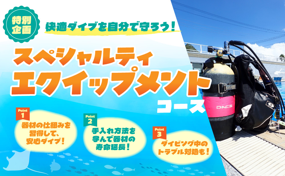 ダイビング器材の知識、手入れ、簡単な修理方法について専門的に学ぶためのコースです。ダイビング器材を安全かつ快適に使用するための知識と技術を学ぶことを目的としています。