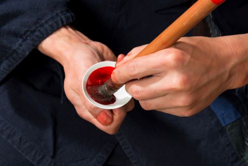 使い方は、水を含ませた紅筆でおちょこの紅をそっと溶かすだけ。すると、玉虫色の表面が鮮やかな赤色へと変化します。