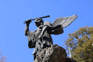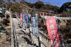 半僧坊の階段は248段。一段ずつ踏みしめて登ります。参道の両脇には、天狗が空から見守り出迎えてくださいます。