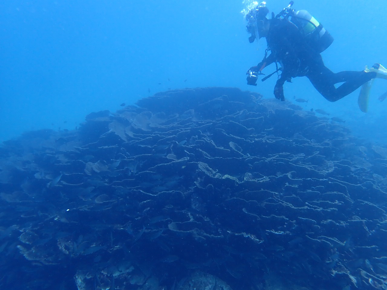 五島の海で有名なのは日本最大級のオオスリバチサンゴです。直径15メートル、高さ5メートルの大きさを誇り、推定500歳程との事。室町時代の生まれってことですね!!