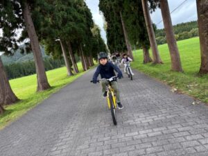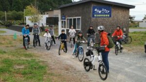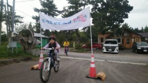 大沼サイクルガイドから安全な乗り方の説明を受け、自転車の調整を行い、試走スタート!