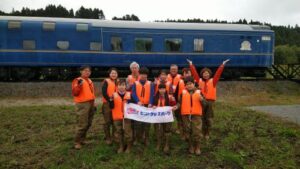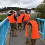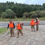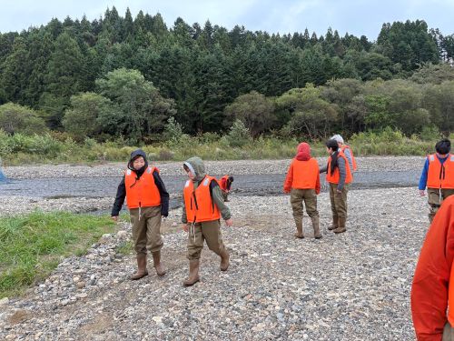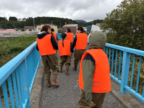 鮭の説明を聞いてみんなで川へ移動。鮭を驚かせないように川へ入ります。
