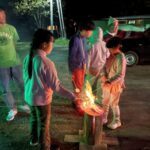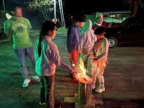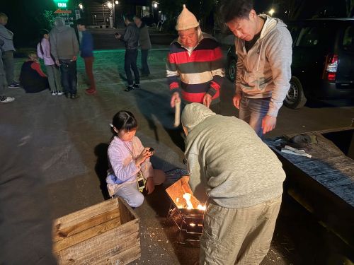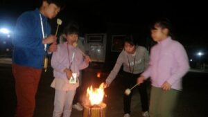 暗くなってきて、スウェデントーチと火起こし体験。ようやく火がつくと、火はどんどん大きくなってきました。あたりは深い暗闇、ゆらゆら揺れる炎。普段では味わえない自然の中での夜を体験。最後はマシュマロを焼いて、ふうふう食べました。