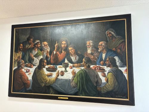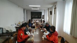 修道院の食堂をお借りして、地元で人気の『ラッキーピエロのハンバーガー』の昼食をいただきました。