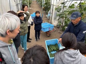 トマト王国へ到着。国王の宗山さんのハウスでの栽培のお話を聞いて、きゅうりとトマトの収穫体験。