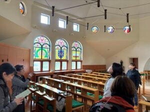 修道院の敷地内にある『カトリック当別リタ教会』も見学しました。教会にはフランスで中世に制作された十二使徒の貴重なステンドグラスがあります。太陽の光がガラスを通して、きれいに室内に注いでいました。