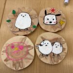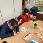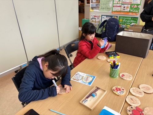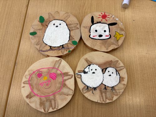道南スギのコースター作り。表・裏面に今回の旅の思い出を描きました。