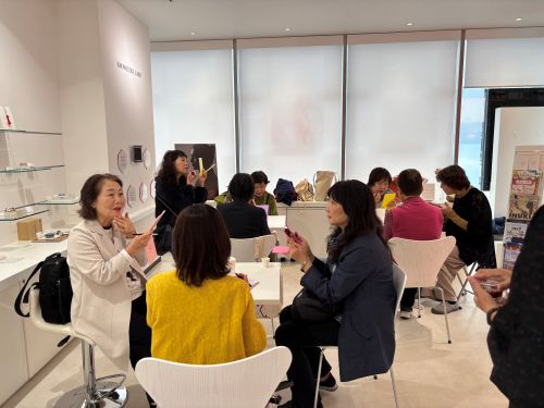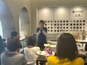 200年続く紅屋 伊勢半について、『化粧』の歴史についてお話をお伺いした後、同じ紅色を点けても人それぞれで発色が異なるという『天然の紅』のマジックを体験しました。女性同士ならではの盛り上がり!その人にしかない、唯一無二の色に魅了されました。