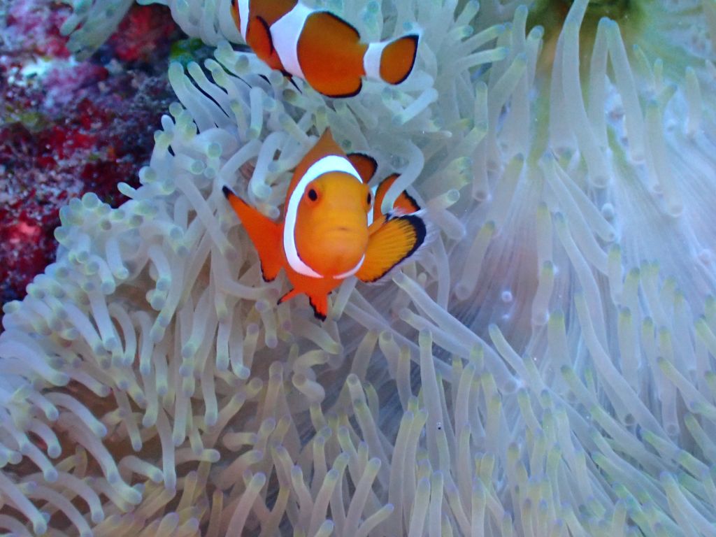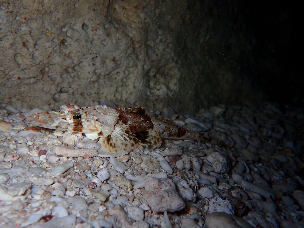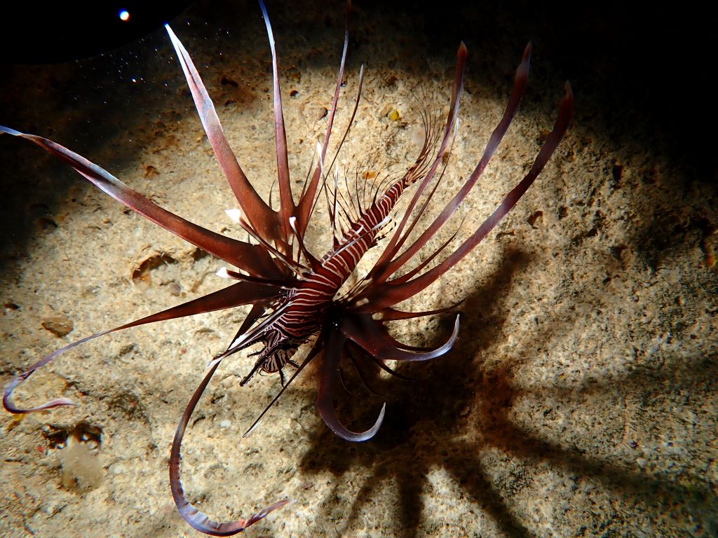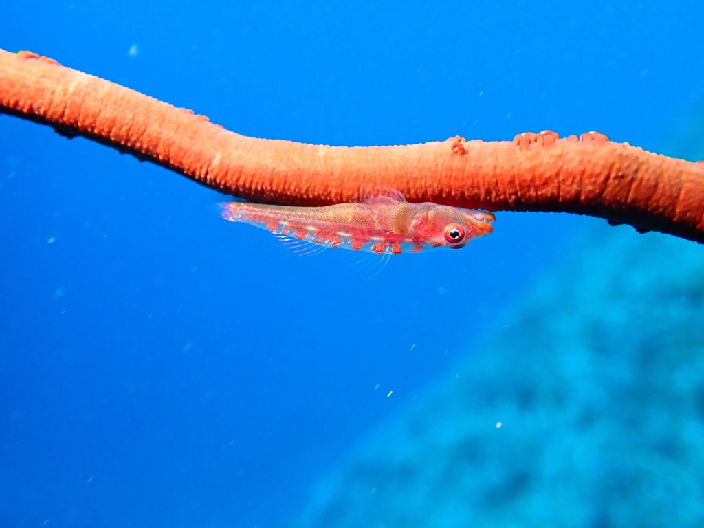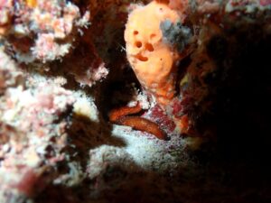 穴の奥にいるフリソデエビがうまく撮れず、手前のカイメンが顔に見えて怖い