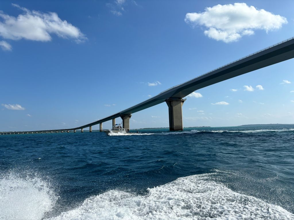 この時期は主に伊良部島、下地島の南側で潜るので無料で渡れる橋として日本一の長さ(3,540m)を誇る伊良部大橋の下を通ってポイントまで向かいます。