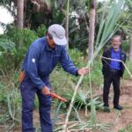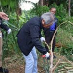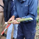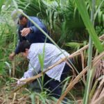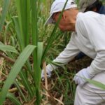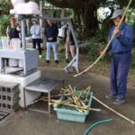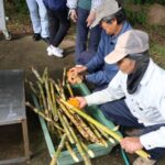 畑へ行き、”なた”でさとうきびを刈り取ります。さとうきびは、細く見えても中身が詰まっているせいか見た目よりも重くて硬く、ようやく刈り取りました。刈り取ったあとは、葉や筋の部分を鎌でそぐようにきれいにします。この道70年の農家の方の鎌さばきはとても見事で、見る見るうちにさとうきびはきれいになりました。