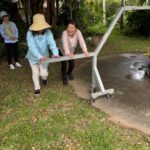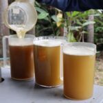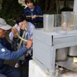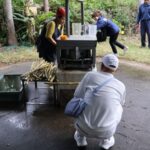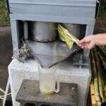 きれいにしたさとうきびを山から流れて来るお水で洗い、さとうきび圧搾機へ入れて絞り出します。昔は牛や馬を使って絞っていたそうで、臼を回す人、さとうきびを機械に入れ込む人と手分けをして作業を進めました。昔もこんな風に作業をしていたのです。
