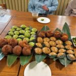 皆でがんばった甲斐があり、たくさんの「さとうきびジュース」が出来上がりました。甘くて美味しいです。シークワーサーを絞って入れると味変を楽しめます。そして、70年前のごちそう【ゆぬくもち】をいただきました。