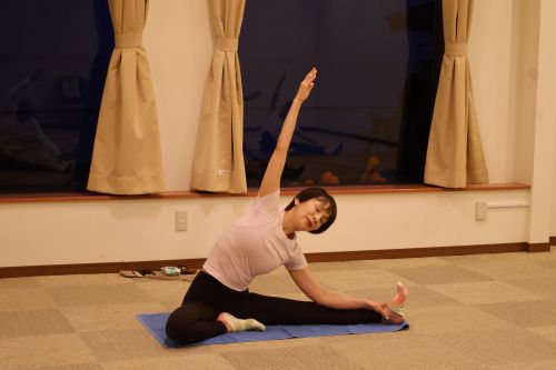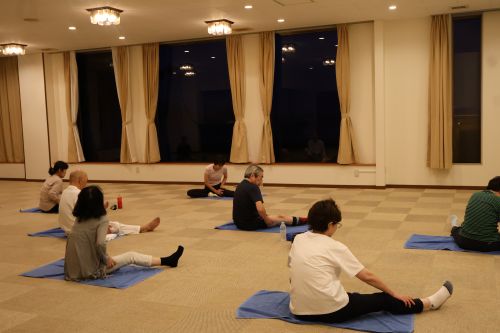 ガラス越しに海を眺めながらモーニングエクササイズ。あたりはまだ暗く波の音も静かです。集中して身体を動かしていたら、いつの間にか周りは明るくなっていました。
