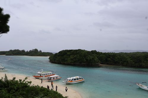 まずは石垣島で絶対に訪れたい川平湾。「川平ブルー」と呼ばれる透明度の高いエメラルドグリーンの海と緑豊かな小島が織りなす景観は「日本百景」にも選ばれるほど。雨でも景色はきれいでした。