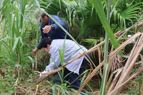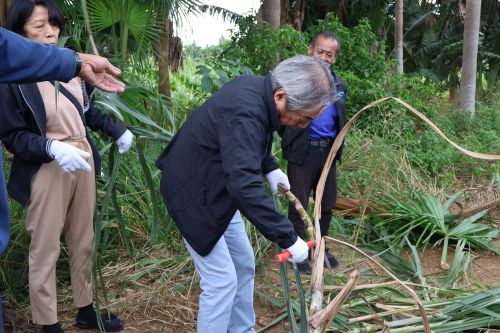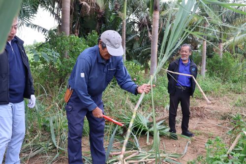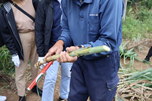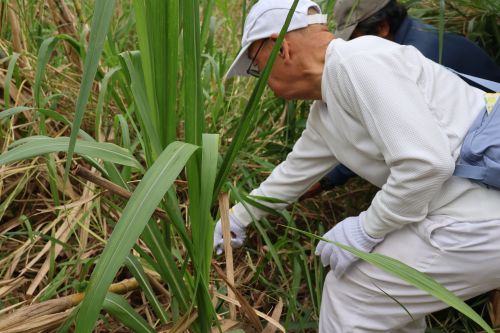 畑へ行き、”なた”でさとうきびを刈り取ります。さとうきびは、細く見えても中身が詰まっているせいか見た目よりも重くて硬く、ようやく刈り取りました。刈り取ったあとは、葉や筋の部分を鎌でそぐようにきれいにします。この道70年の農家の方の鎌さばきはとても見事で、見る見るうちにさとうきびはきれいになりました。