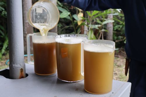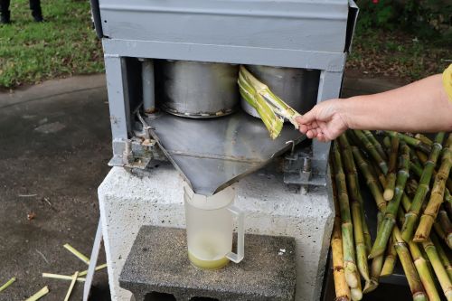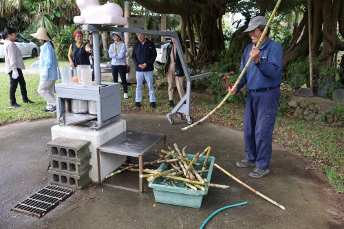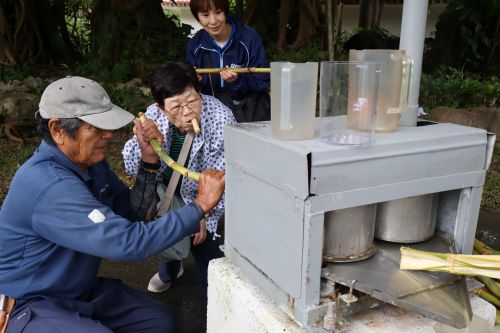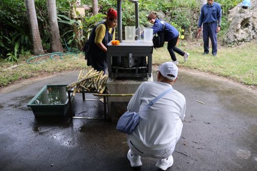 きれいにしたさとうきびを山から流れて来るお水で洗い、さとうきび圧搾機へ入れて絞り出します。昔は牛や馬を使って絞っていたそうで、臼を回す人、さとうきびを機械に入れ込む人と手分けをして作業を進めました。昔もこんな風に作業をしていたのです。