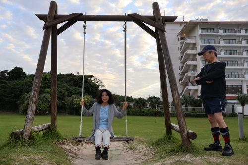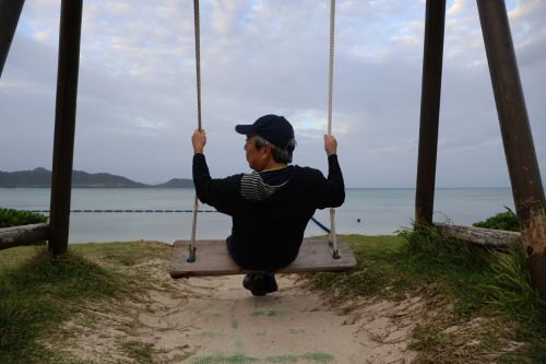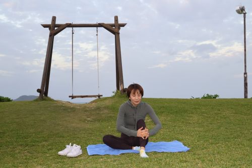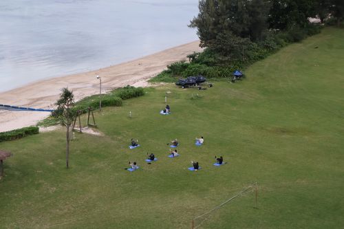 朝のお散歩とピラティスを楽しみました。シーサイドホテル内の芝生でアーシング。波の音をBGMに行うピラティスはとても贅沢でした。念願のブランコにも乗れて、童心に返られていました。