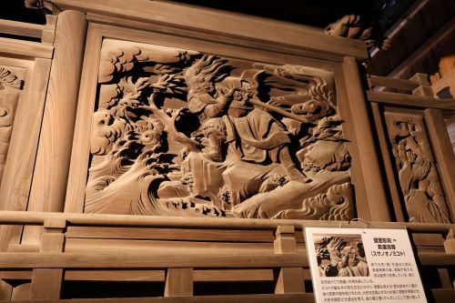 市(いち)の守り神を祀った社。当時は道の真ん中にありました。祭神は、商売・火防の神である素戔嗚尊(スサノオノミコト)。お堂内には八岐大蛇(やまたのおろち)、素戔嗚尊(スサノオノミコト)、奇稲田姫(くしなだひめ)、の彫刻があります。必見です。