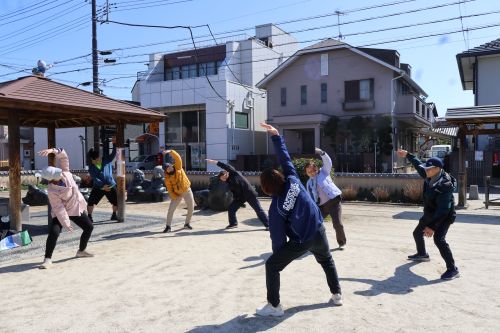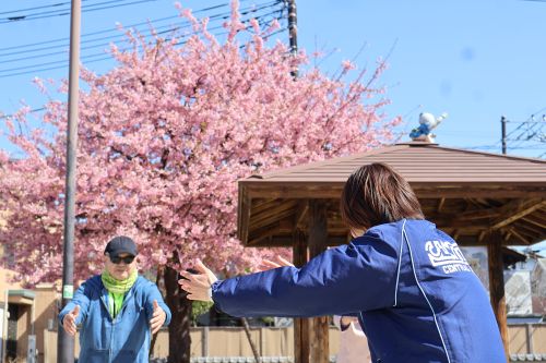 河津桜がみごとに咲く公園で、石川ナビゲーターによるスタンディングピラティスの体験をしました。朝吹いていた冷たい風は静まり、ぽかぽかと暖かくなってきました。