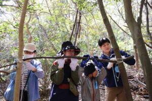 木を柱にみたて、木と木の間に枝を渡し基地の骨組みを作ります!