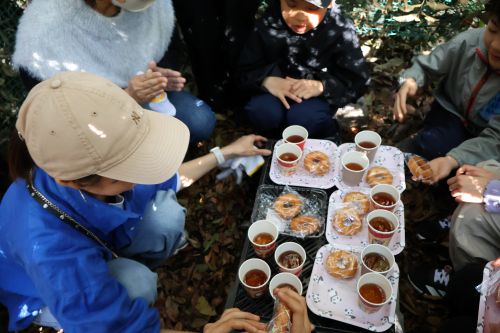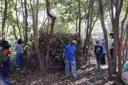 子供と大人、みんなで力を合わせて造った秘密基地。完成です!最後はみんなで基地の中に入りおやつタイム。楽しかったね!