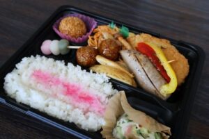 お弁当は谷津の割烹『芳の』さんのお弁当。習志野はソーセージ発祥の地。珍しい『習志野ソーセージ』を特別に入れていただきました。