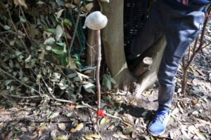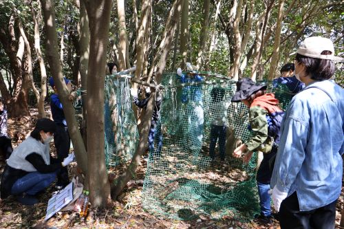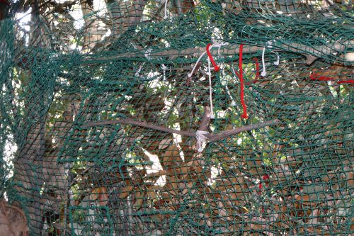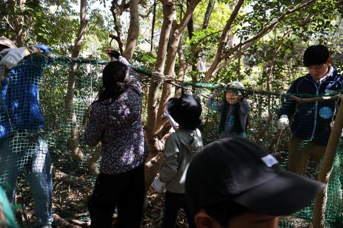 ネットが重さで落ち込まないよう、枝とネットをきっちり結びなおしたり、紐をつなげて長くして、枝を補強したりと全体的に整えたり。周りをみながら必要なことを判断し、大人も子供もすぐに行動に移していきます。