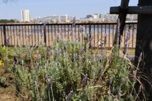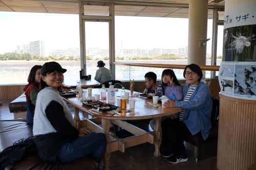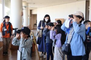 干潟の柵のところまで行き、双眼鏡を使って水面を観察しました。レンジャーの方が見やすく設定してくださった望遠鏡は、双眼鏡よりも遠くにいる生きものを見ることができました。