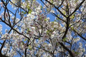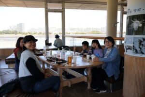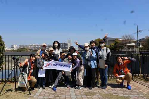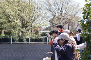 谷津干潟をバックにみんなで記念撮影。谷津干潟には春らしい桜やきれいなお花が咲いていました。