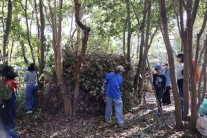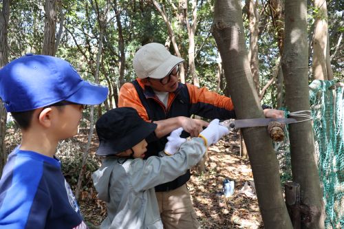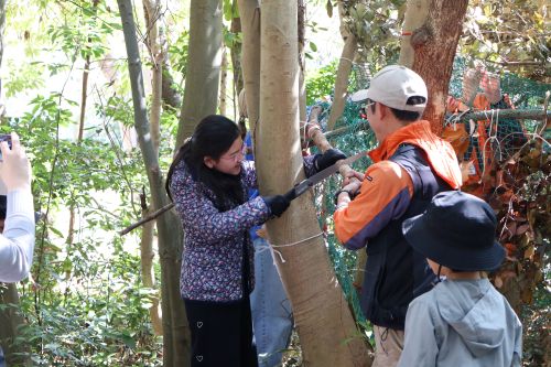 出入りする際に危なくないように、またきれいに見えるように枠組みを整えます。レンジャーと一緒にのこぎりを使い、飛び出している木を切断しました。