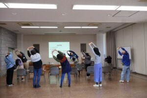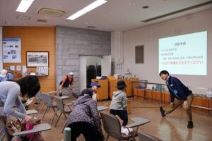 午後は、お待ちかねの『秘密基地づくり』。カラダをたくさん動かすので、大江インストラクターによるヨガをまじえた準備運動でカラダをほぐしました。