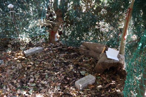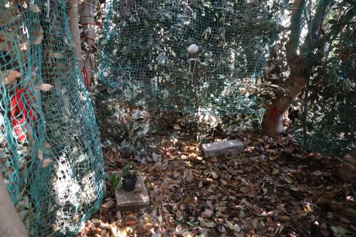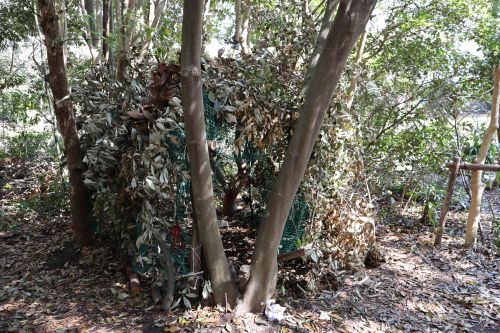 だいたい半分くらい出来上がった秘密基地。まだ緑のネットと向こう側が見えている状態です。